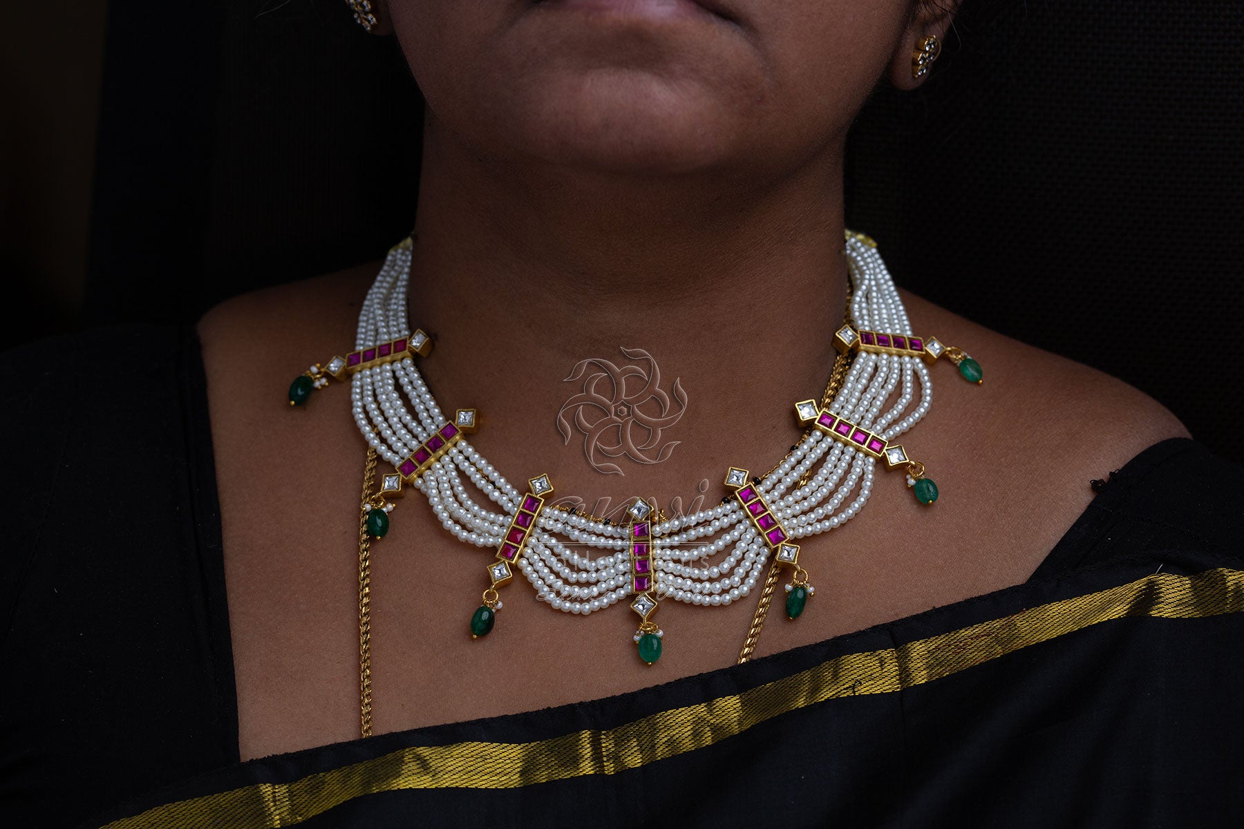 6-Line Pearls choker with jadau kundan brooch in-between with green bead & tiny pearl cluster hangings