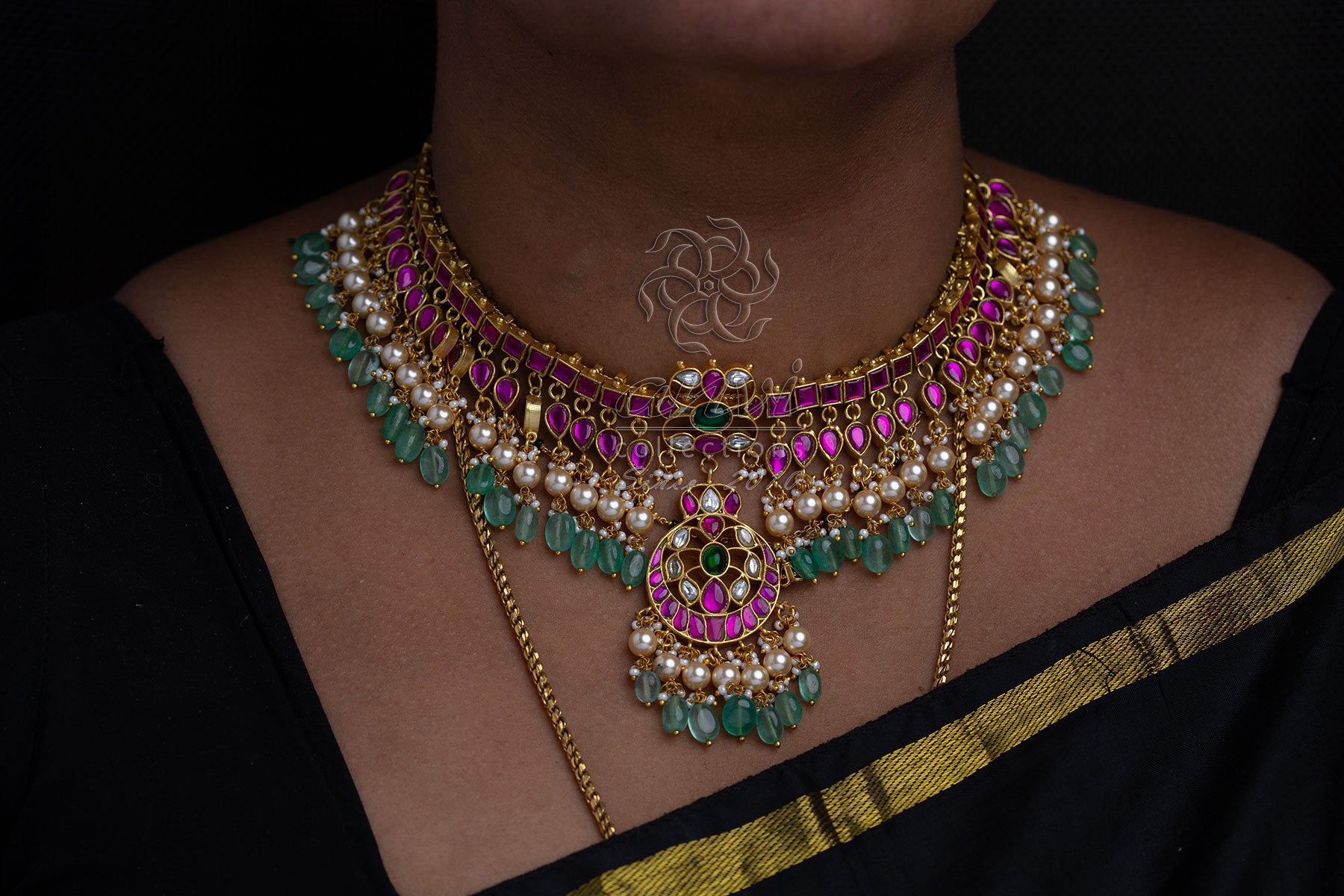 Red Kundan choker with central pendant & drop pendant with pearl and strawberry bead hangings