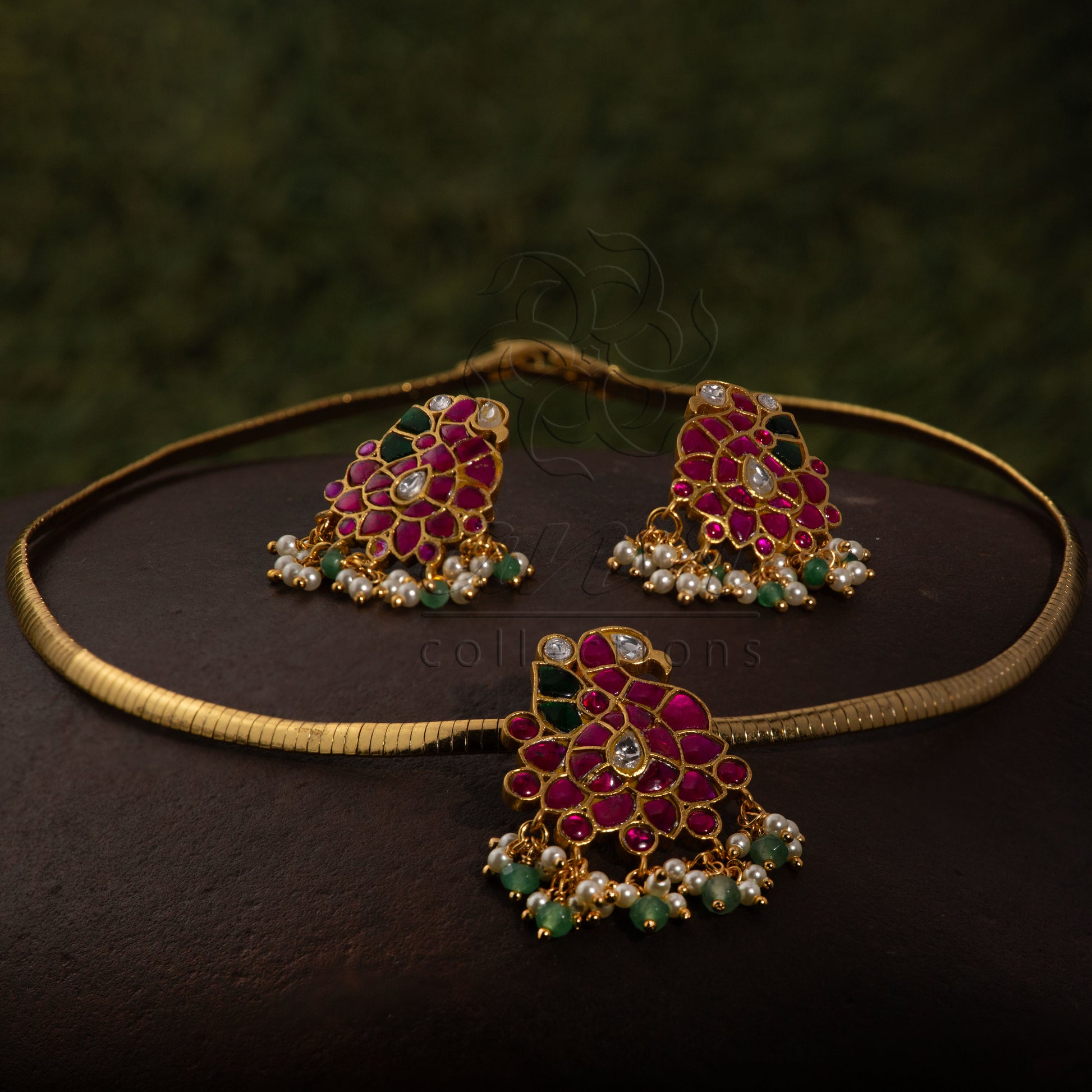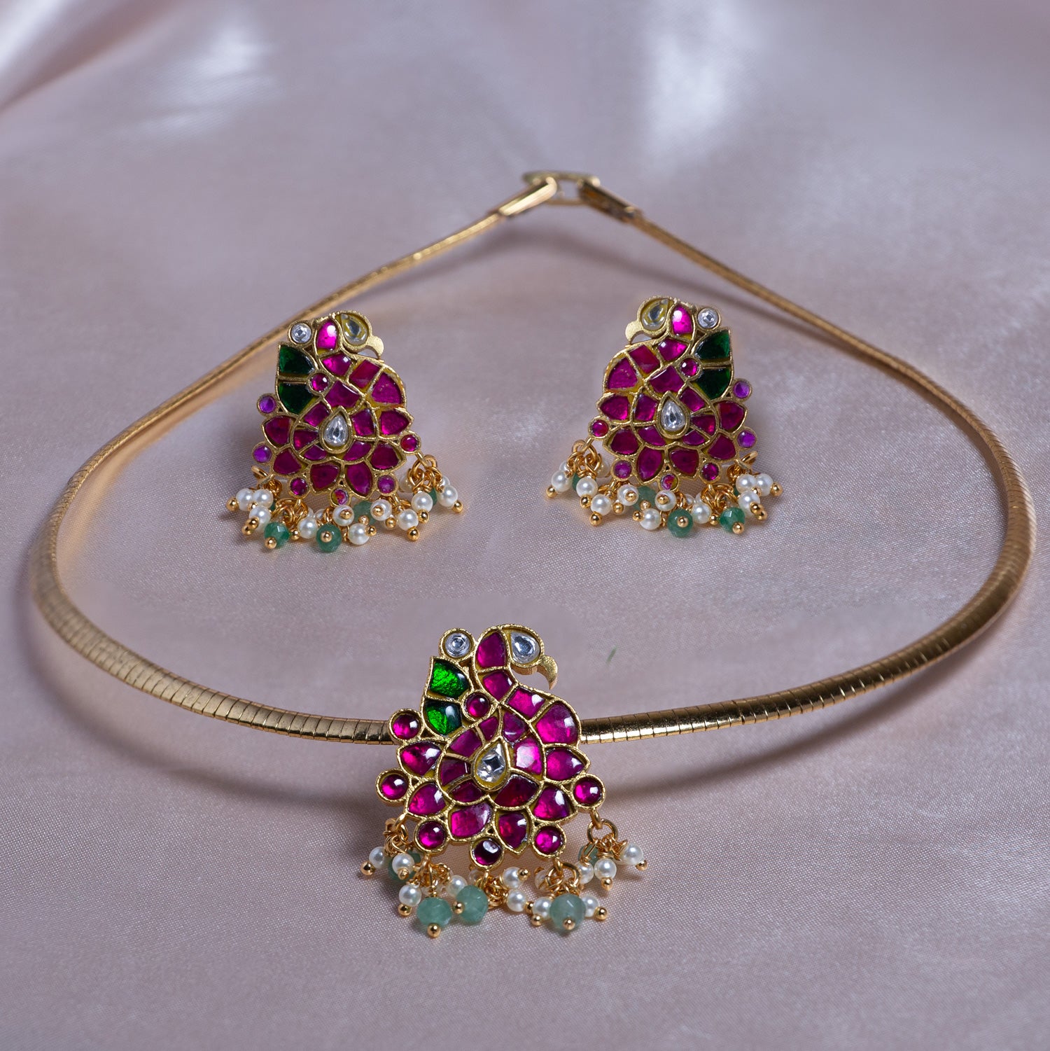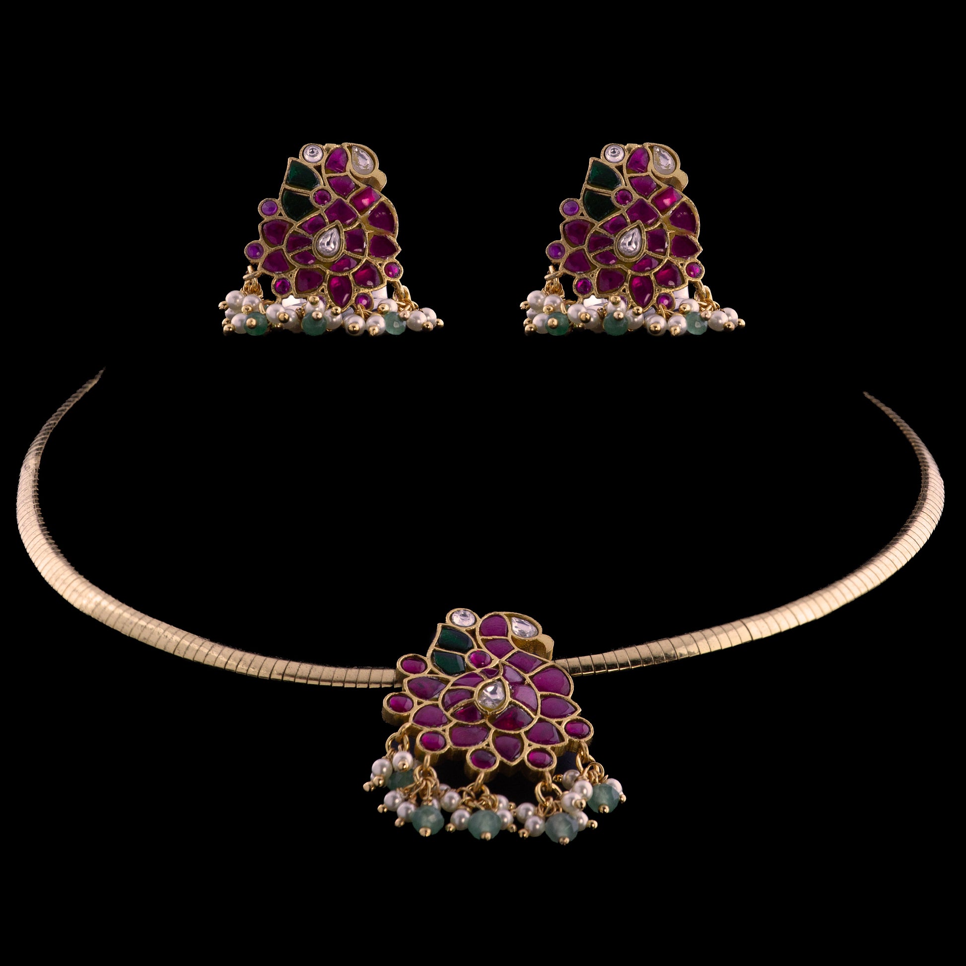 Kante with Jadau Kundan Pendant with earrings in Brass with gold polish