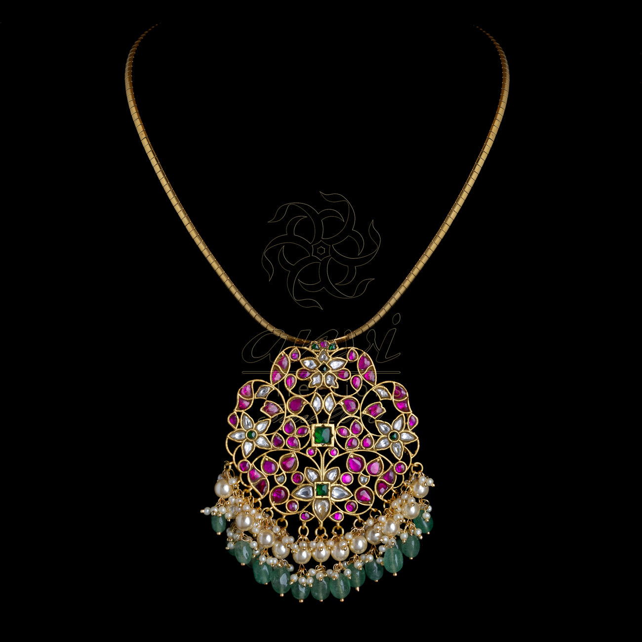 Chain with big Jadau Kundan Pendant with pearls & Russian beads offered without earrings in Brass with gold polish